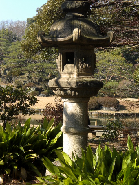 六義園にはいろいろな石灯籠があります。中には、人間の背丈以上のものもあります。