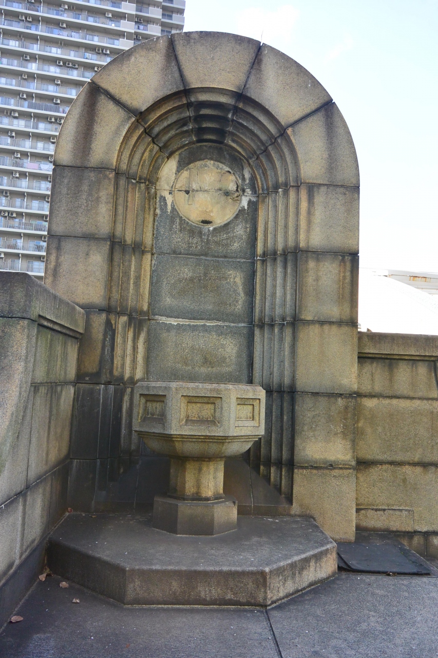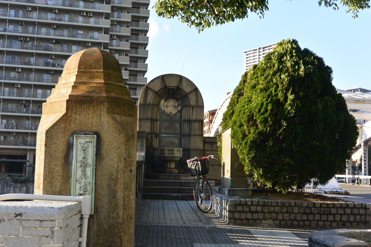 あみだ筋が堂島川を渡る橋で、アーチの架かる美しい橋です。1927年の建設で、橋の両脇には石の装飾が施されています。が、その装飾の前には木の植え込みがあって、一見すると見えないようになっています。また放置自転車が少なからずあったのは残念です。