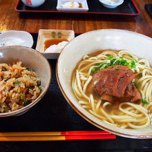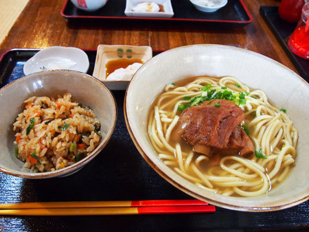 沖縄そば+三枚肉セットをオーダーしました。セットにすると