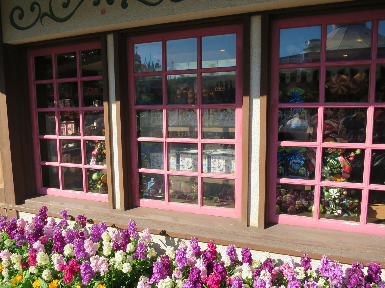 お菓子専門のショップなので、ついつい入ってしまいますね。店内には大きなキャンディーがディスプレイされていますし、お店の外にも色とりどりのお花が植えてあるので、これぞファンタジーランドのショップという雰囲気です。