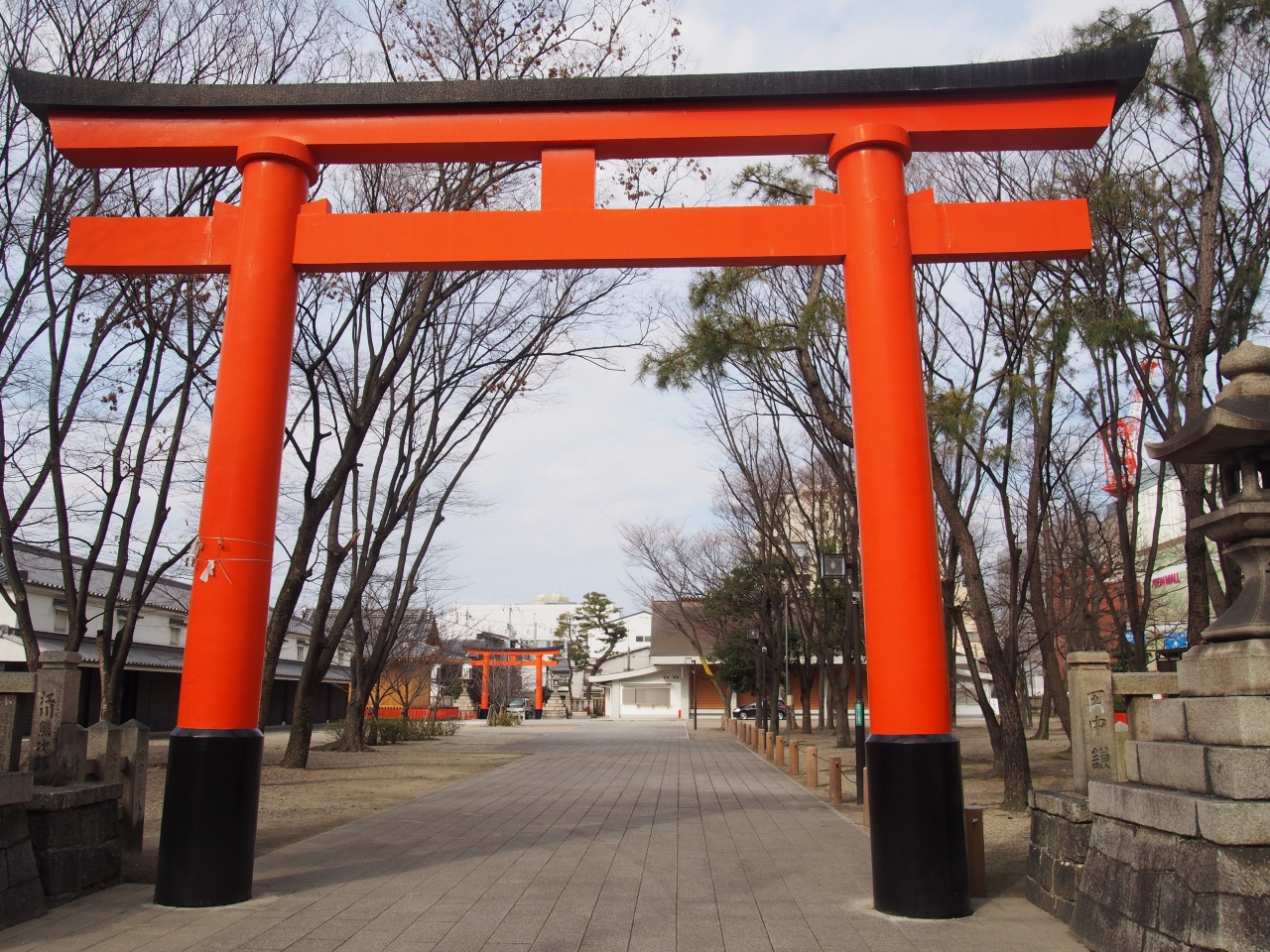 京都駅の八条口から東寺へと向かう途中に大きな赤い鳥居が目立つ伏見稲荷大社御旅所を見かけました。伏見稲荷の神様が旅の途中に一時休まれる場所ということで、4,5月の稲荷祭の時はにぎわうようです。訪れた1月は大きな境内は閑散としていました。