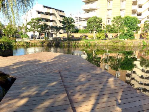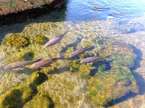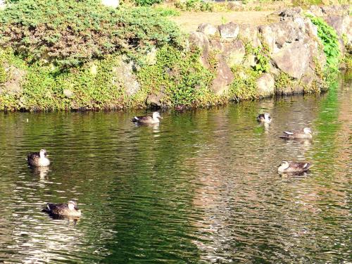 菰池の上にかかるウッドデッキからは、池に泳ぐ大きな鯉をはじめ小魚や鯰、沢山の鴨たちが眺められます。