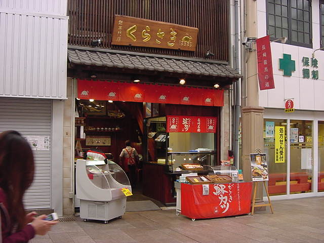 多くの観光客や買い物客でにぎわう浜町アーケードの中にある老舗です。鯨の専門店。こういう店があると言うだけでも、長崎に来たと実感できます。店頭では鯨カツや鯨の竜田揚げを販売しています。揚げ立ての鯨カツは食べ歩きにも絶好です。