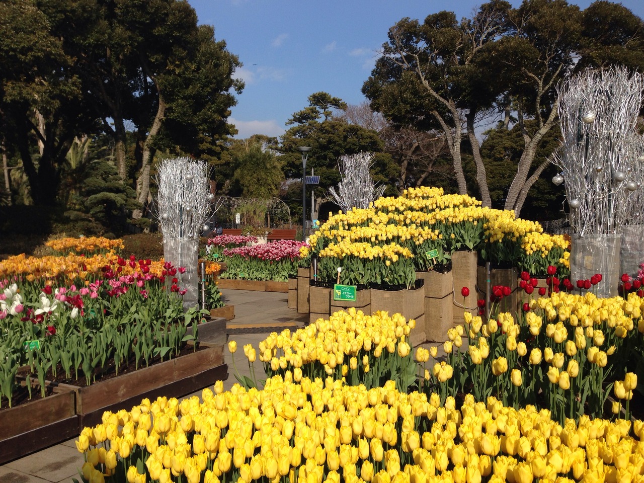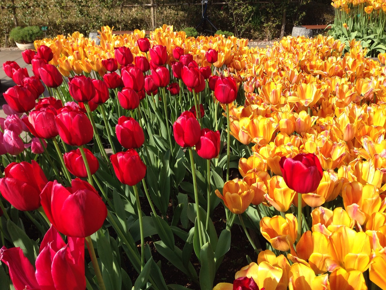 この日はチューリップ祭り、カラフルな花がとても可愛らしく 沢山の方が撮影をしていました。苑内はチューリップだけでなく 椿も沢山の種類が咲いていました。回路のような作りで花をゆっくり楽しめます。