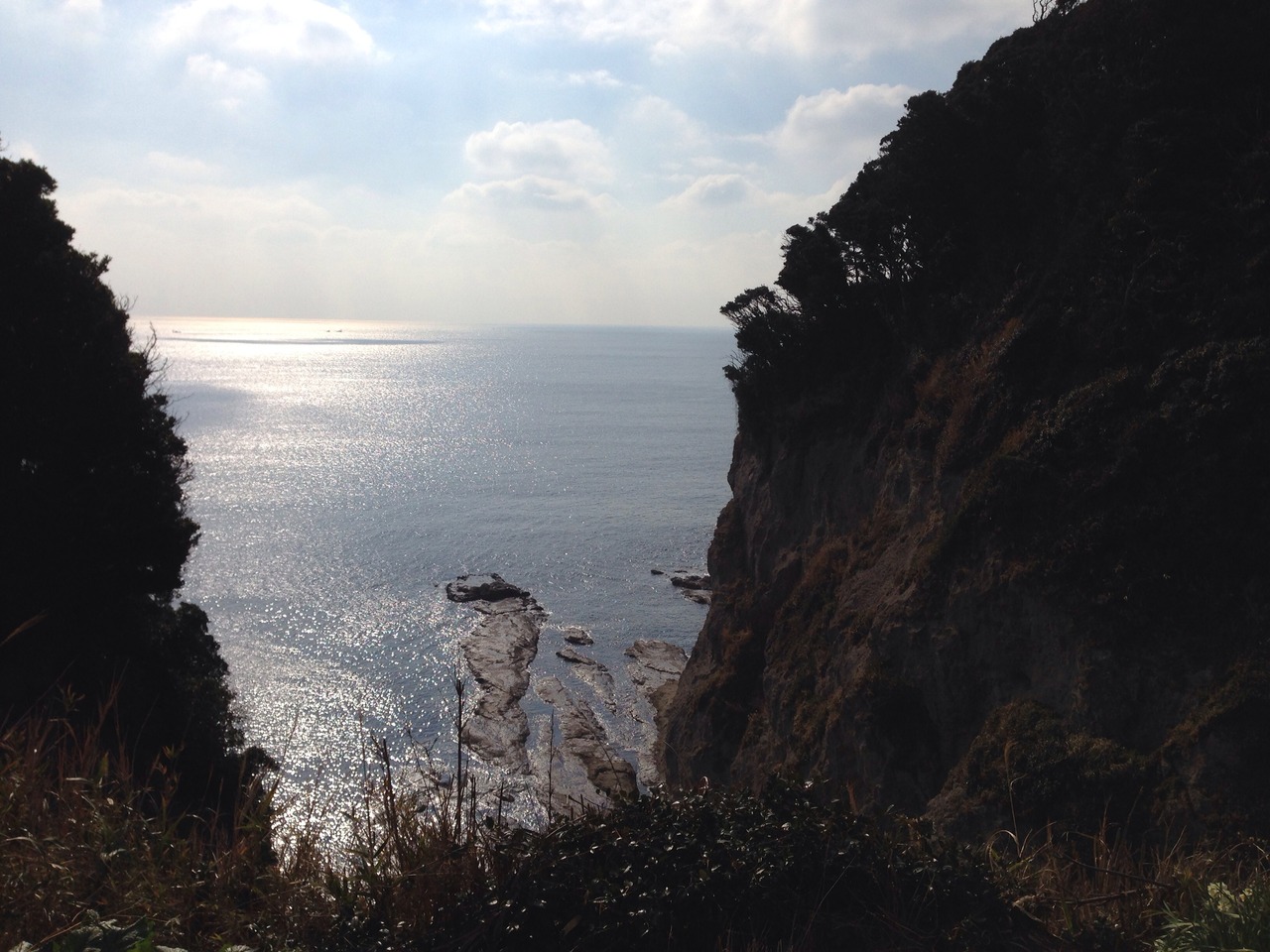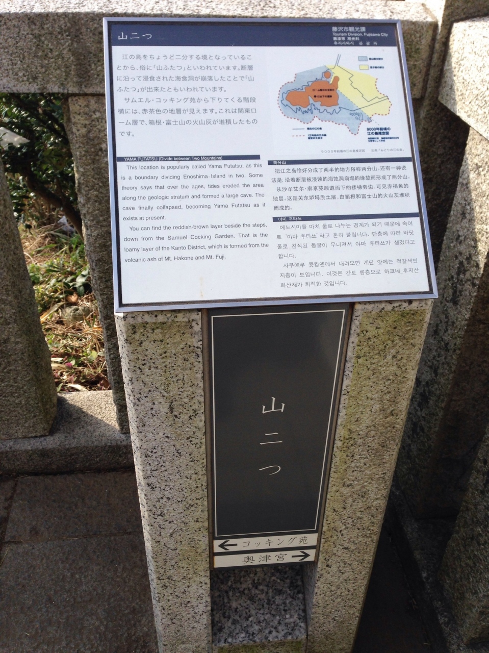 江ノ島の頂上まであがり 岩屋へ向かう途中、急な階段をくだると境目に到着。ここが 山ふたつ です。