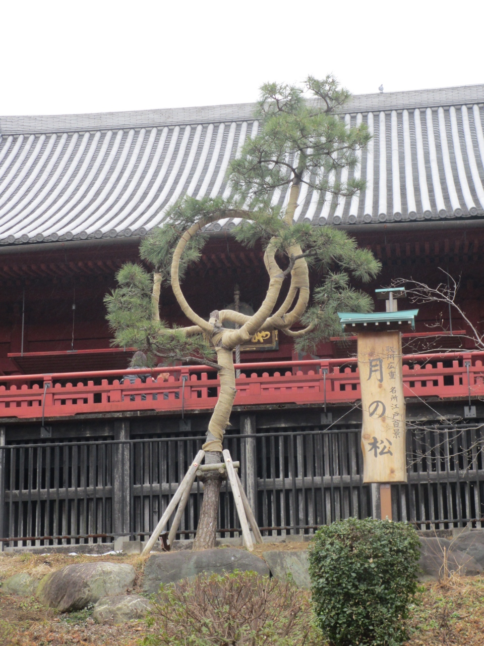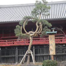 上野恩賜公園内の清水観音堂の前にある松の木です。公園の丘に建つ清水観音堂から不忍池の弁天堂の方を見るとすぐ目に入ります。江戸時代の浮世絵師歌川広重の名所江戸百景の「上野清水堂不忍ノ池」、「上野山門月のまつ」に描かれてます。明治初期の台風の被害で失われていましたが、2012年に新たに現代の造園技術により復元されました。