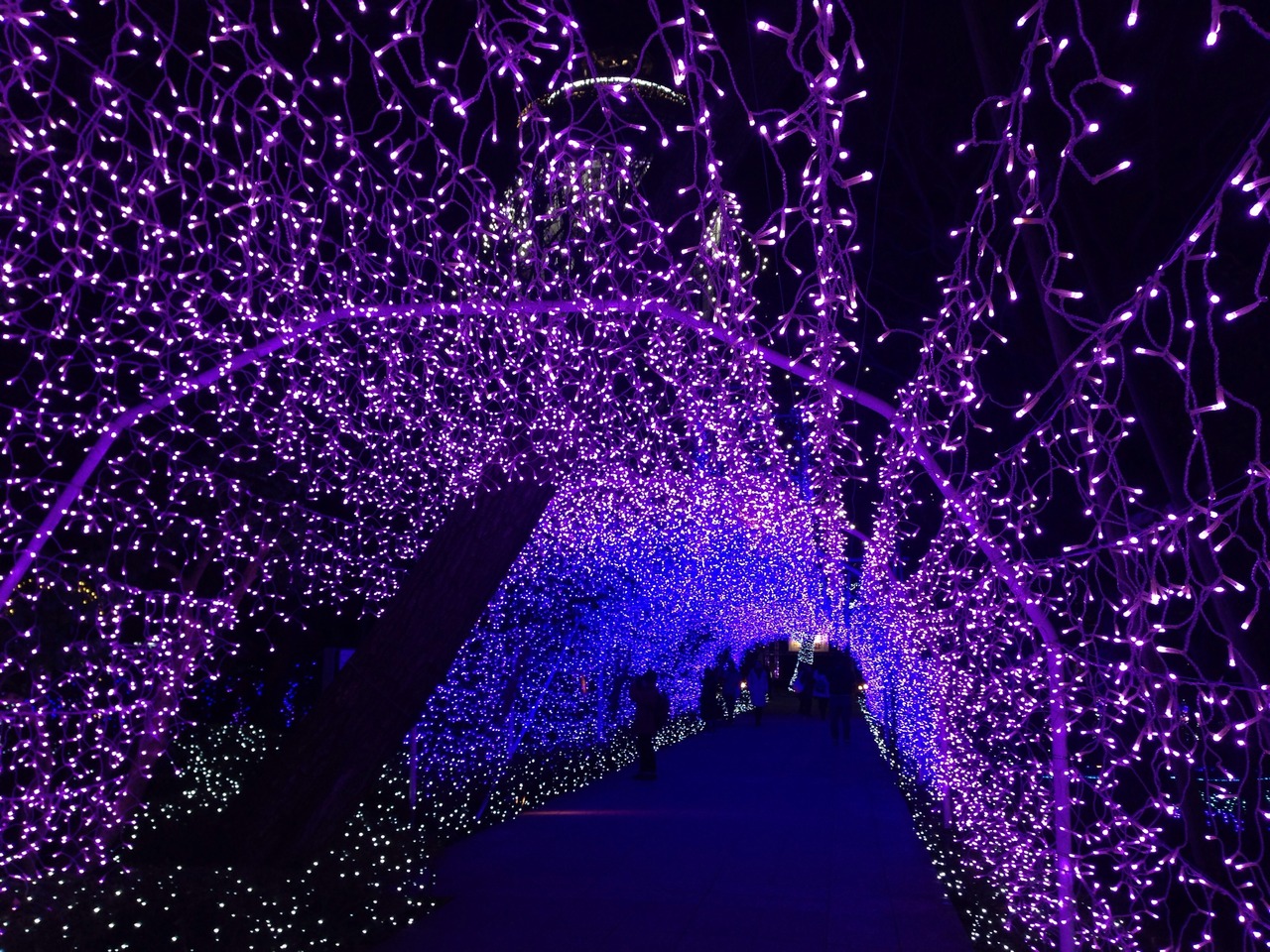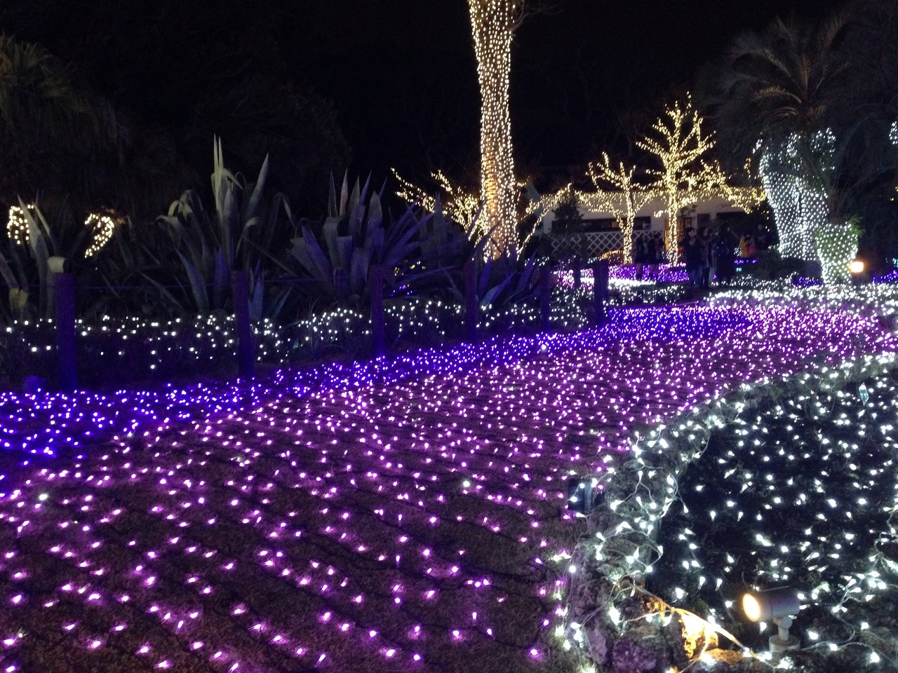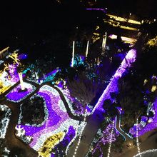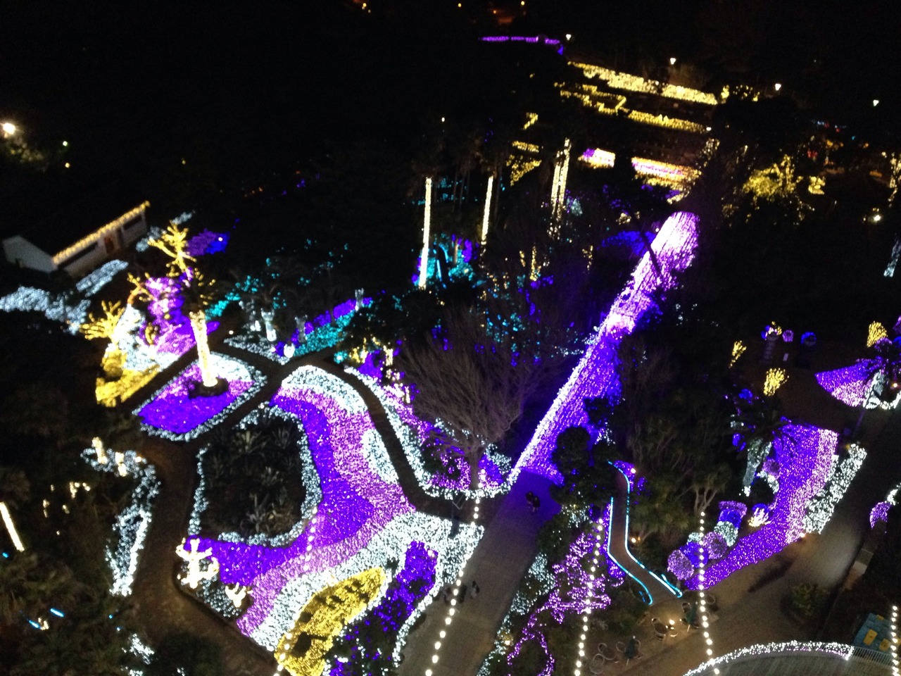 サムエルコッキング苑内はほぼイルミネーションで色どられていてどこを歩いても楽しめる。木々だけでなく 地にも電球が敷き詰められているので 光のじゅうたんの上を歩いている様でした。展望台からは夜景も見えるし、最高でした。