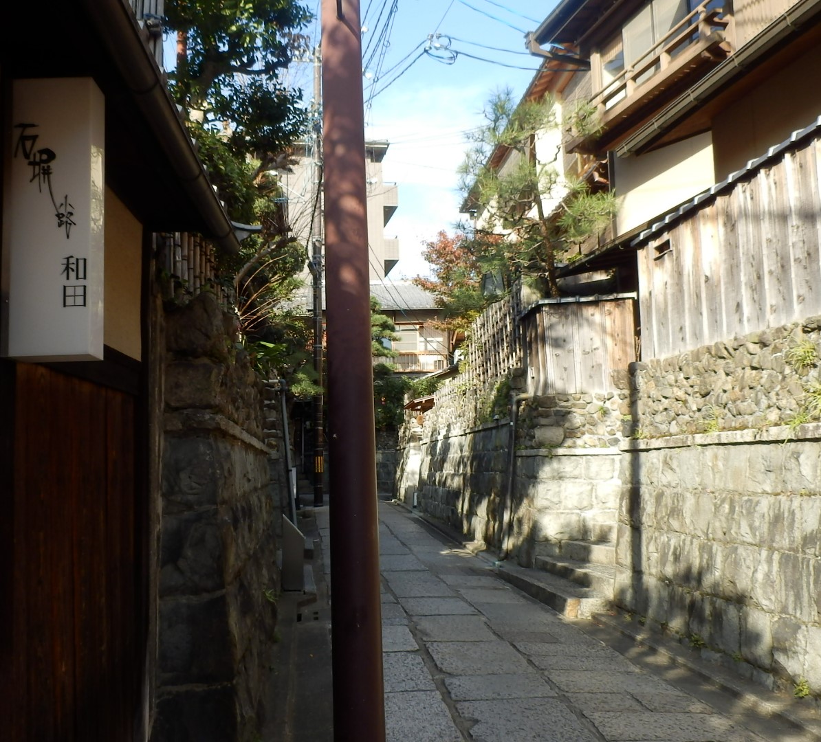 京都の東山、祇園付近にある、ここは何度も通っているがこの場所の説明が難しい。下河原通から東へ伸びている幅3M程の石畳の小道,八坂神社からは南楼門を出て南方向へ直進,どこを曲ったのか失念、右側に石塀小路への案内があります、この石畳は昔京都市電の敷石だったらしい,小路の両側には高級料亭、旅館などが並んで最も京都らしさ感じられる場所です、伝統的建造物群保存地区に指定されています