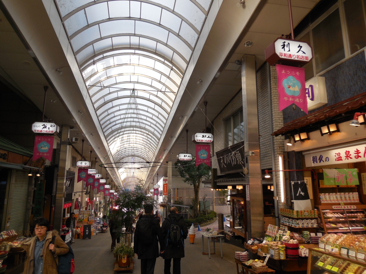 平和通り商店街とこの商店街が熱海駅から並行するように延びています。華やいだ雰囲気があるのはこちらの商店街だと思います。ホテルや旅館のチェックアウト時間の10時過ぎには、大きなカバンを持った観光客で賑わっていました。