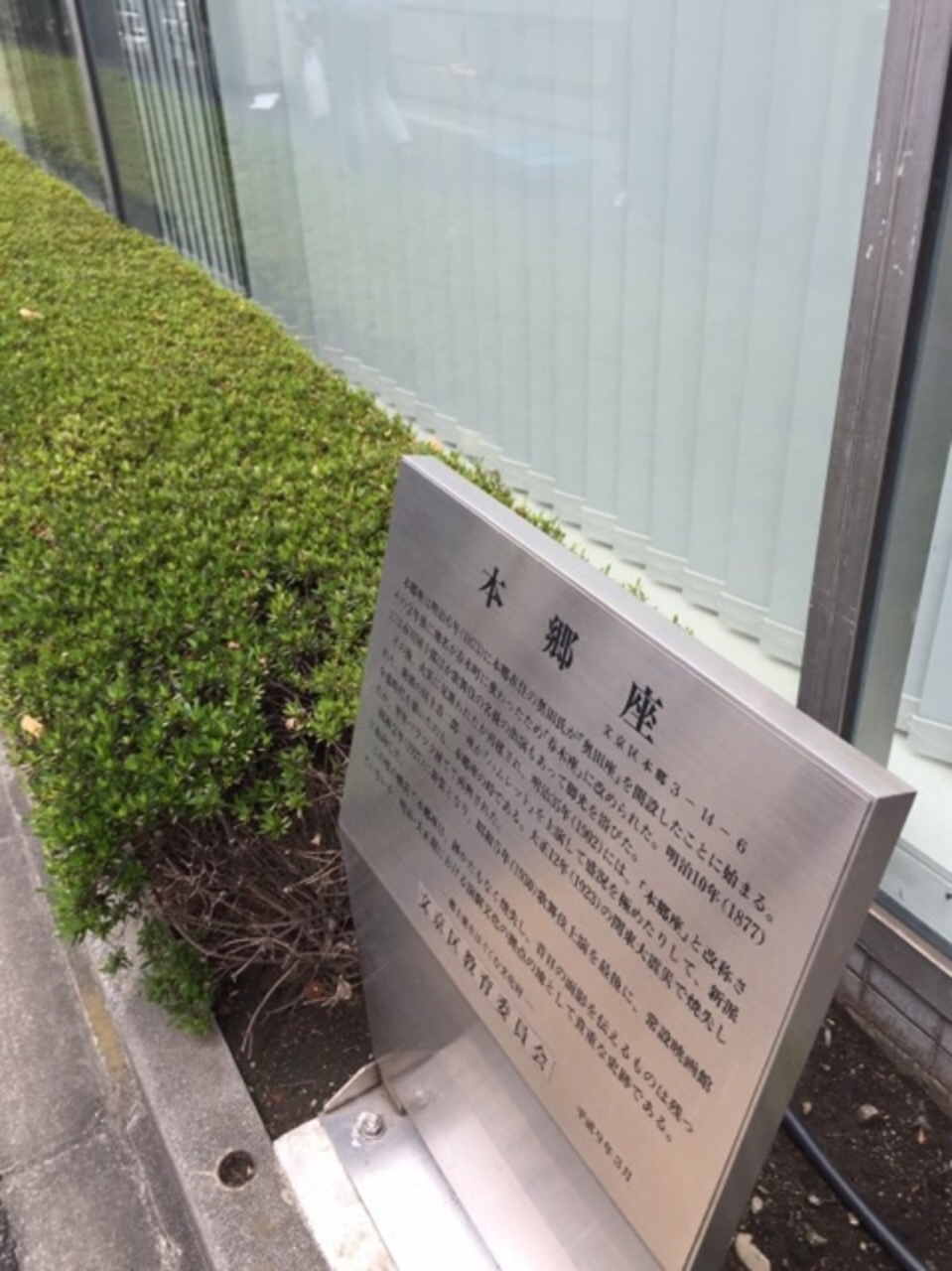 1873年、本郷の地主奥田氏が奥田座を開設し、3年後には所在地の名をとり春木座と改名し、その後、1902年には本郷区の区名を採り本郷座と改称したそうです。