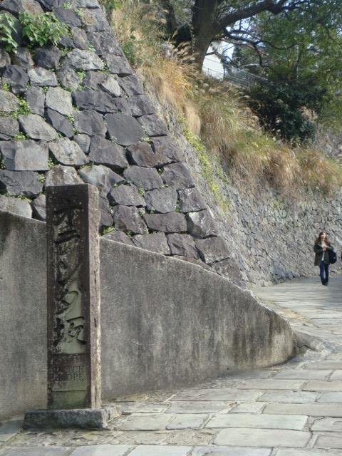 いわゆる日本三大がっかり名所(他には札幌の時計台・高知のはりまや橋)のひとつと言われています。しかし神戸や函館、横浜などの洋館や外人墓地付近の洒落た坂道ではありませんが、私的にはレンガ塀が残る石畳の坂道は素朴で、坂上にある活水女子大学とよくマッチしています。
