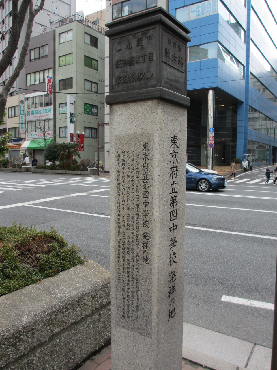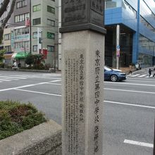 飯田橋駅東口から九段下に向かう目白通り沿いの歩道にいくつかの標柱が立ってます。その一つで飯田橋駅のそばにあります。明治15年に国学を研究する目的で設立された皇典講究所に、明治21年に補充中学校が開校されました。この中学校がいくつかの名を変えて明治34年東京府立第四中学校として開校しました。明治37年に市ヶ谷加賀に、戦後戸山に移転し、現在の都立戸山高等学校となってます。