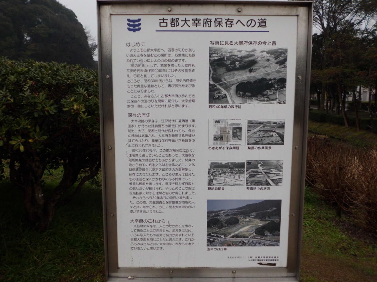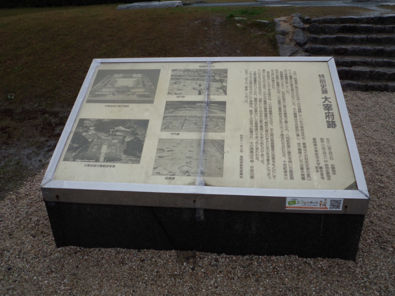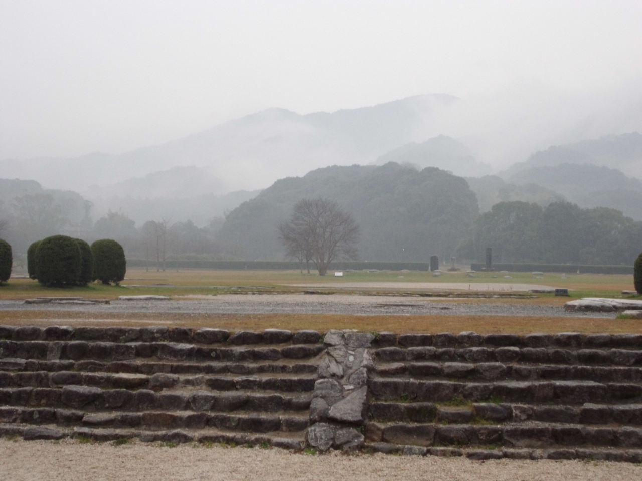 雨の中訪れた太宰府政庁跡は、バックにそびえる山々に霧がかかり幻想的な雰囲気を醸し出していました。その昔、外国との交渉と守りの重要な拠点であった事に思いを馳せて散策しました。大きな柱の跡が幾つもあり規模の大きさが伺えました。