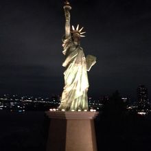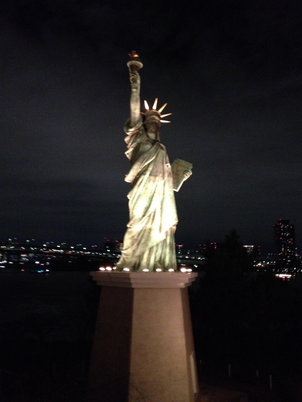 自由の女神像は夜になるとライトアップされています。暗い海が背景なので、ライトアップされた女神像はとても目立っていました。前のデッキでは女神像の周辺だけ中国系のツアー客の記念撮影で渋滞…。通過するのに苦労しました。