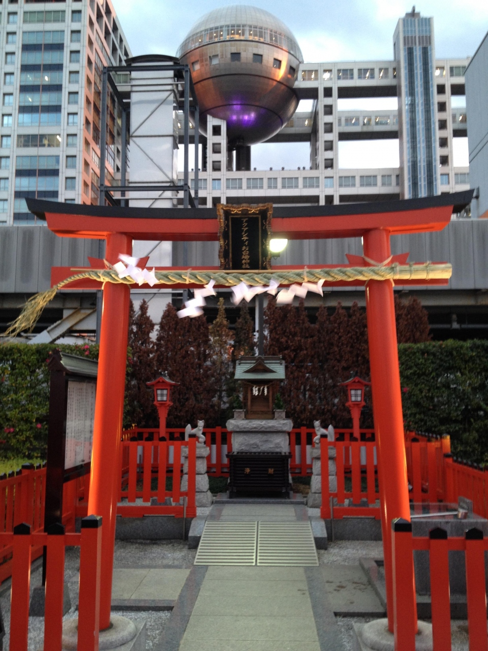アクアシティの屋上に神社があるなんて知りませんでした。駐車場の脇なので用事がなければ来ることはないでしょうね。簡素な神社ではありますが、朱塗りの鳥居の向こうにはフジテレビの球体が。お台場らしい記念撮影スポットになりますね。
