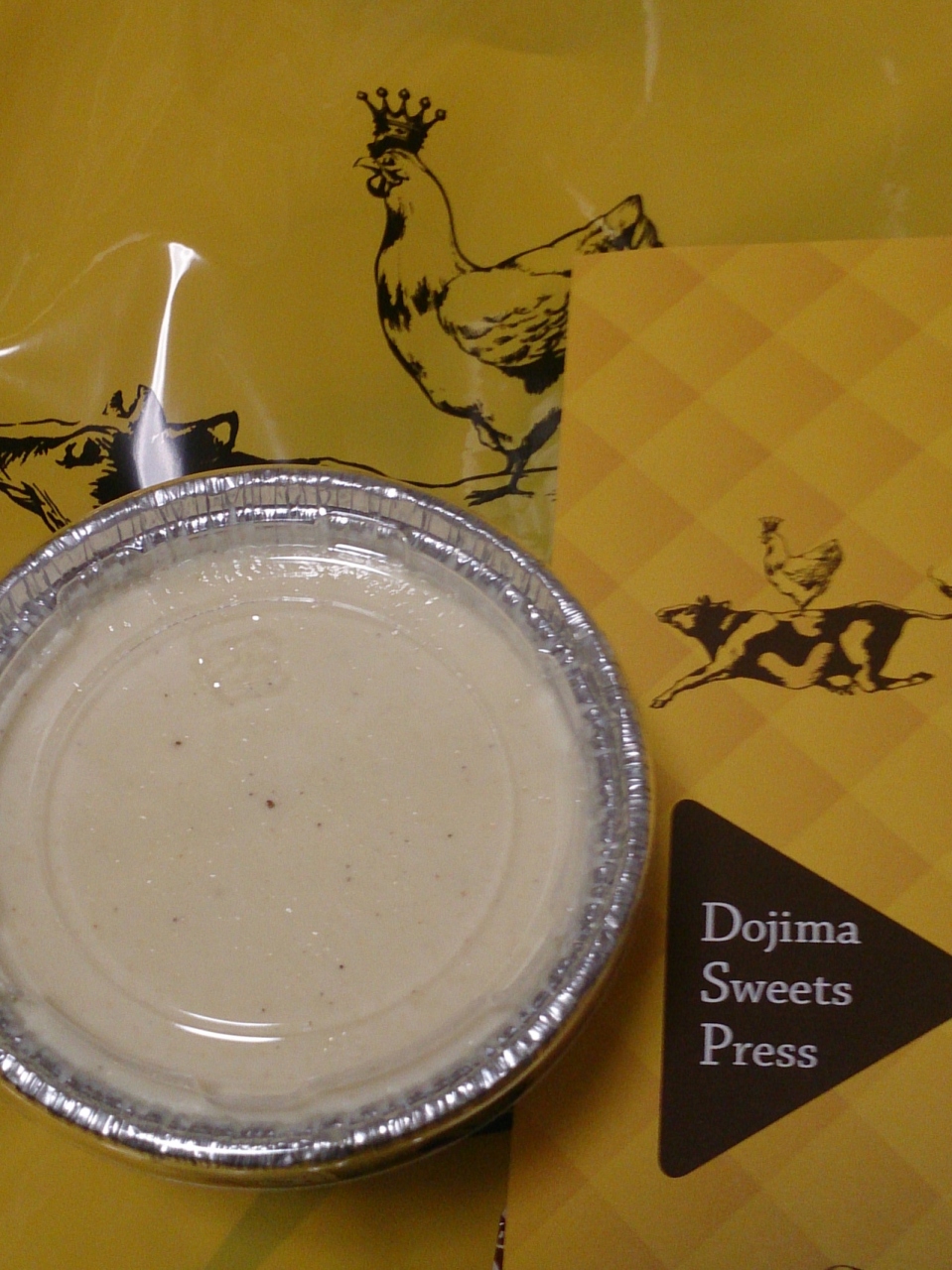 堂島プリン、マダムプリン、魔法のロール、焼菓子の中から、堂島プリンと焼菓子のレモンケーキを買いました。堂島プリン300円は、天然バニラビーンズ、卵、牛乳、生クリームが入っていて、中はあっさり、表面はざくざく食感のカラメルソースで、まさにクレーム・ブリュレ。マダムプリンはミルクと卵がたっぷりの弾力あるプリンとか。次回は魔法のロールを食べなければ!