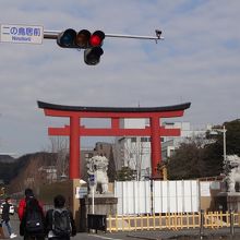 鶴岡八幡宮の二の鳥居は若宮大路、「段葛」の入口にあります。関東大震災で倒壊するまでは、一の鳥居、三の鳥居とともに徳川四代将軍家綱寄進の石造鳥居でしたが、現在は鉄筋コンクリート造りのものです。「二の鳥居」前の「鶴岡八幡宮」の碑は、東郷平八郎の筆によるものだそうです。段葛は整備工事のため通行できませんでした。