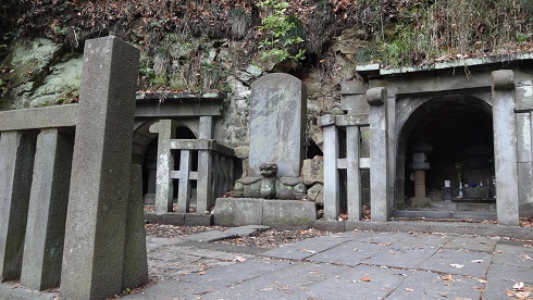白旗神社を東方向へ進むと左手に石段があります。それを上ったところに三浦一族の墓といわれるやぐらがあります。三浦一族は宝治合戦で北条と戦い、三浦泰村以下一族郎党500人がここで自刃したといわれます。その奥にある石段をさらに上ると「やぐら」が3つ並んでいます。これが大江広元・島津忠久・毛利季光の墓といわれています。大江広元は京都の公家で、頼朝に招かれ鎌倉幕府の基礎固めをした人物です。大江広元の子孫は毛利氏を名乗り、西国で有力な戦国大名になりました。