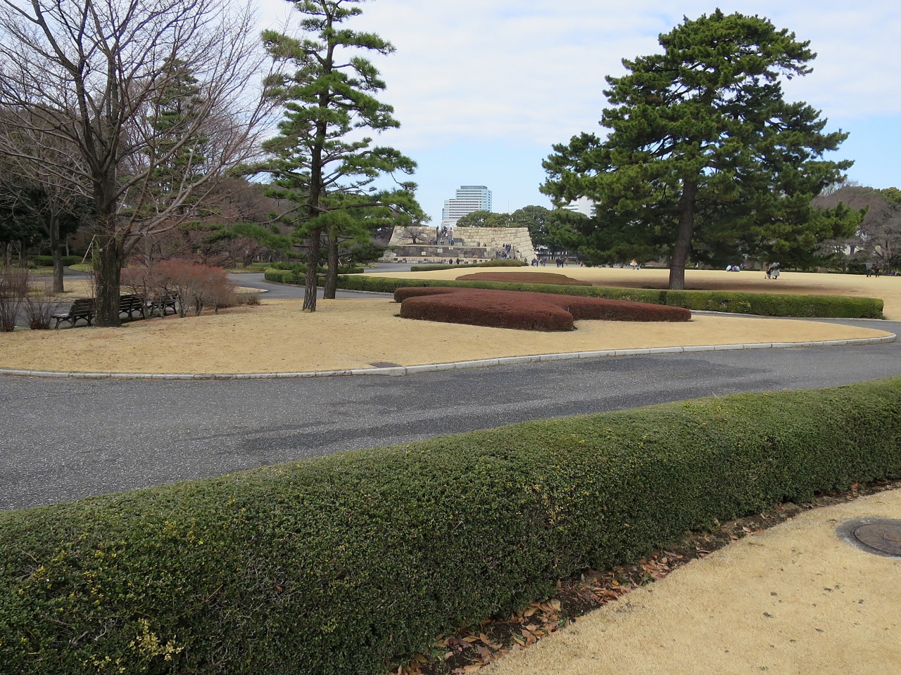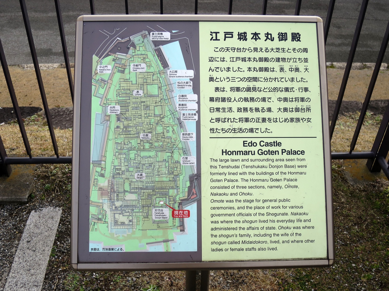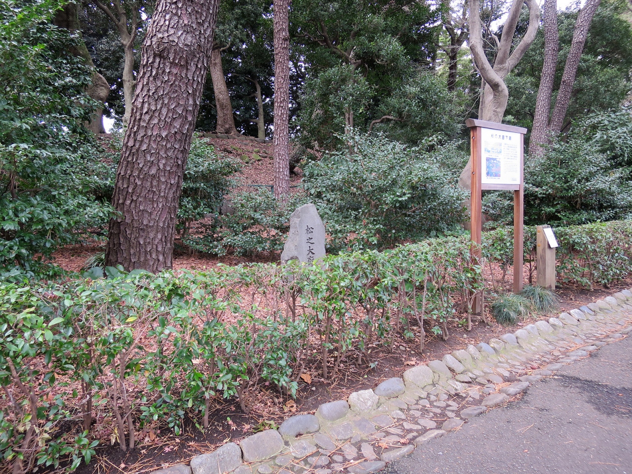 現在の「本丸跡」の中央部分は美しく整備された広い芝生広場になっており、温かい日中などには、お弁当を広げる人の姿もありますが、その周囲には現存する「天守台」や「石室」、また「松の大廊下跡」や「大奥跡」といった史跡が残されているなど、かつて江戸城の本丸であった面影が点在しています。また竹林やツバキ園を散策したり、梅を愛でたりと、色々な楽しみ方のできる史跡総合公園とでも呼べるような場所になっています。