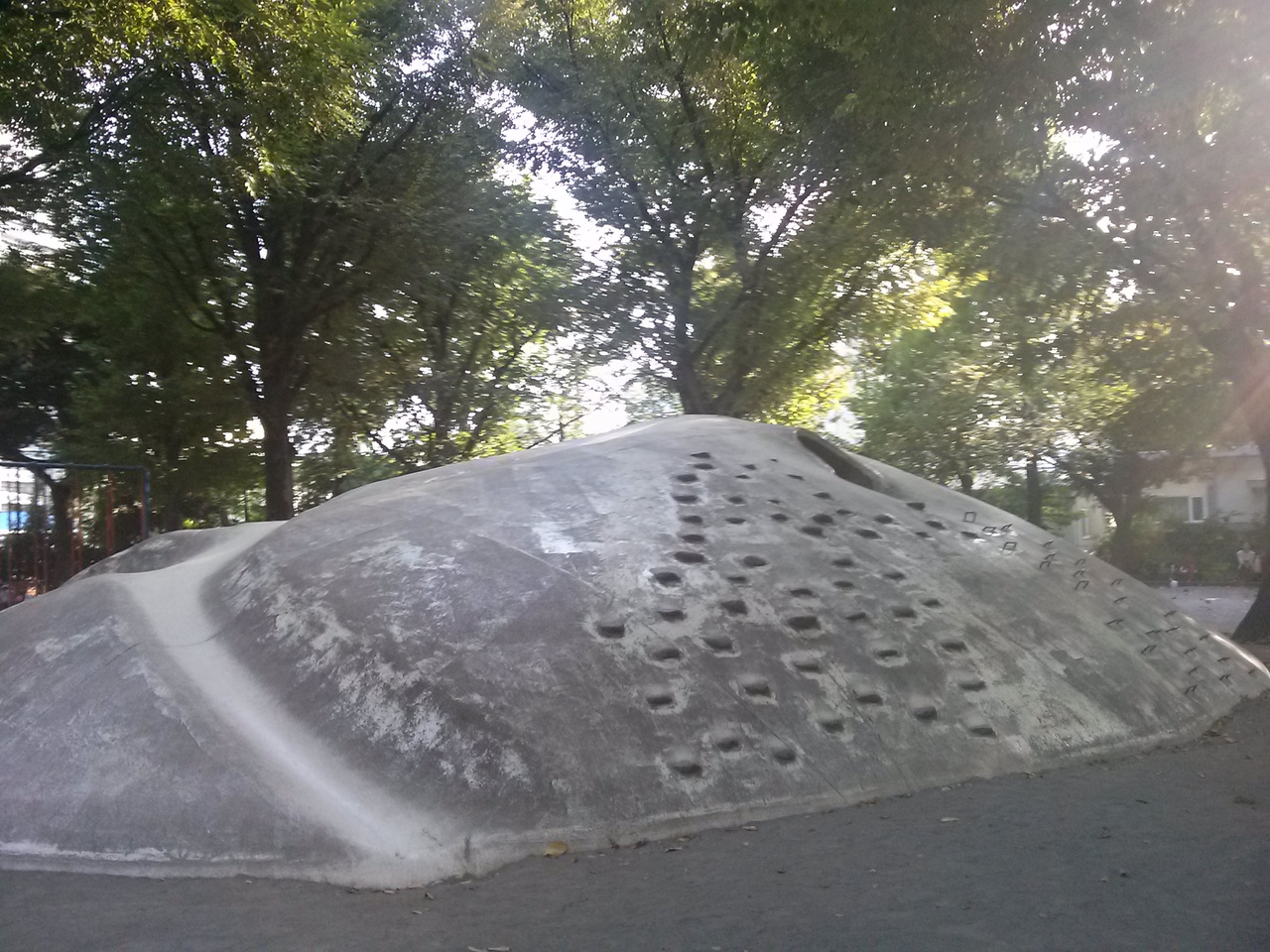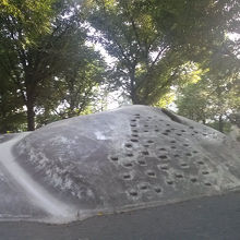 メインの遊び場は公園の中心にある大きな石の山!子供は思わず上りたくなる山です。登るのが難しい乳児や園児は、階段を使って登ることができます。真ん中にトンネルがあり、かくれんぼにも鬼ごっこにも最適です。