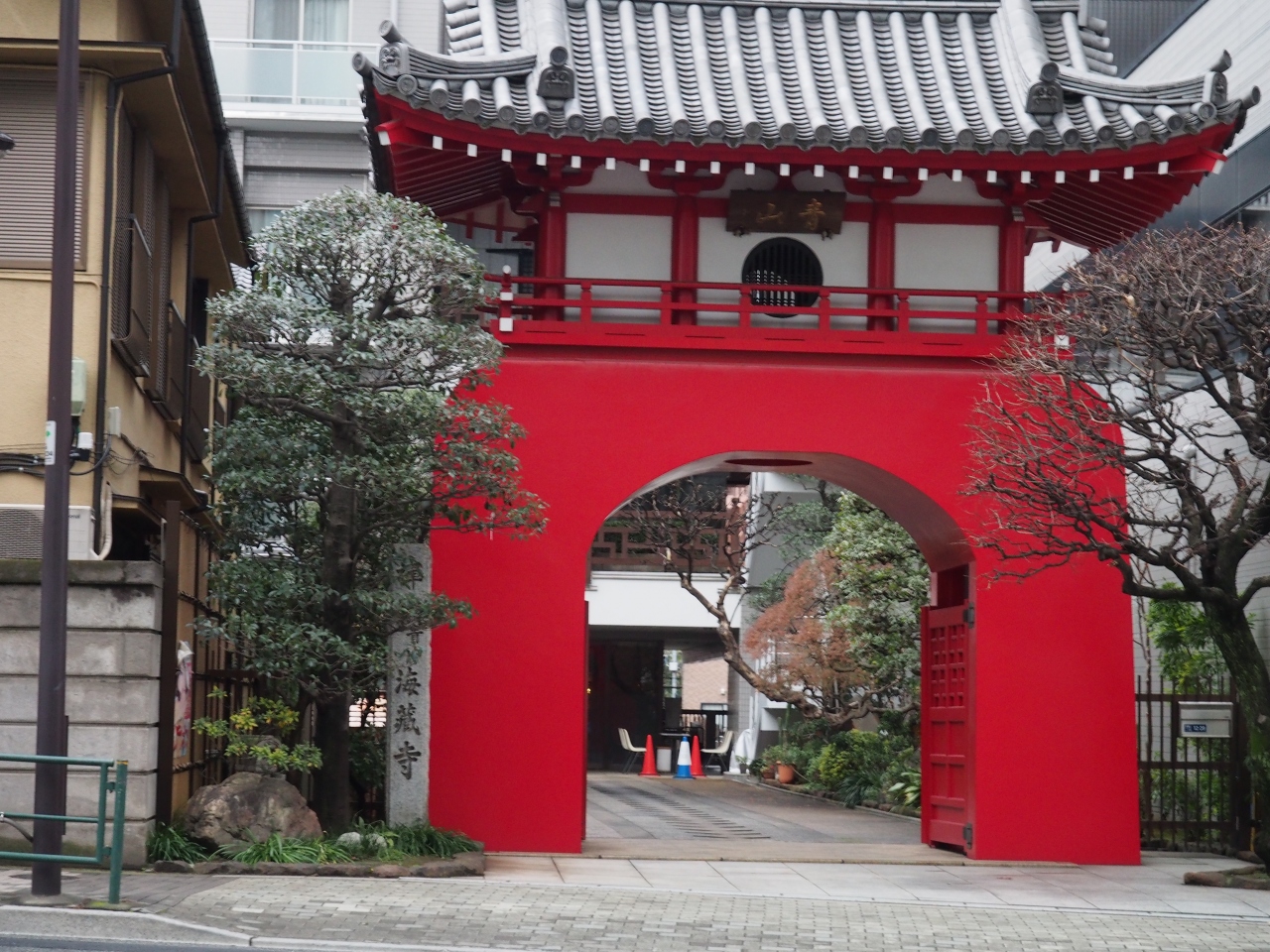 ビルの間に挟まれて、目を引くのはなんといっても写真のこの赤い門です。