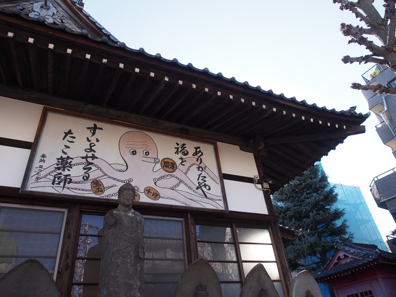 お寺自体はそれほど大きくないのですが、寺の側面(入り口からは正面、建物でいうと側面)にユーモラスな大きな蛸の絵がかけられているのが面白かったです。不動尊の前後に立ち寄って見るといいと思います。