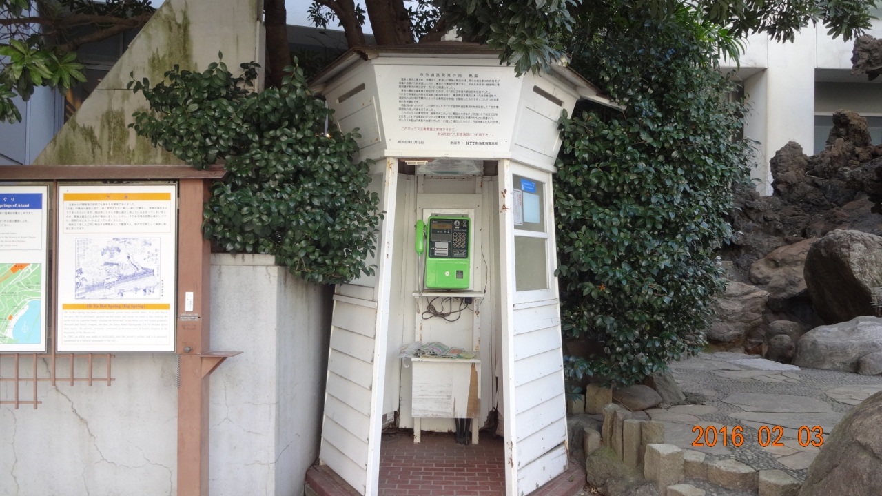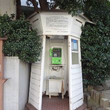 レトロな公衆電話ボックスが建っていて、同じ敷地内に大湯間欠泉があります。
