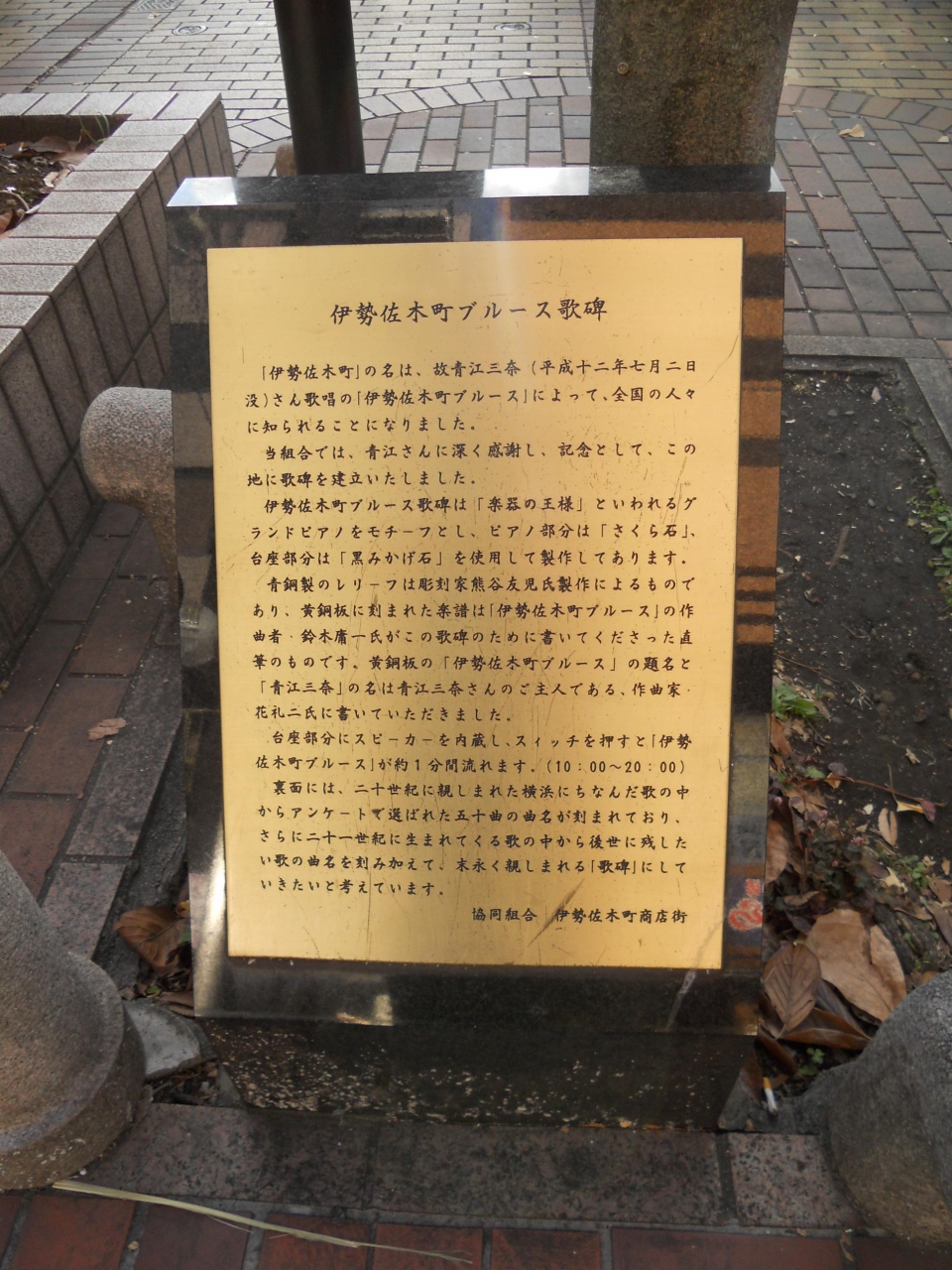 故青江三奈さんが1968年に歌われた「伊勢佐木町ブルース」の楽譜がピアノ型の像に刻まれており、スイッチを押すと約1分間が流れます。