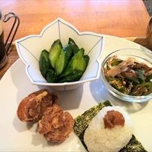 新感覚のおにぎりカフェでした。定番の梅、カツオから、珍しいオニギリの具材もあり、選ぶのが難しかったです。ランチのセットは唐揚げ、ご飯、お惣菜、おにぎり2つついて、お得なセットでした。店内はかわいいイス、ソファが置いてあり、女性の方が落着けそうな空間でした。