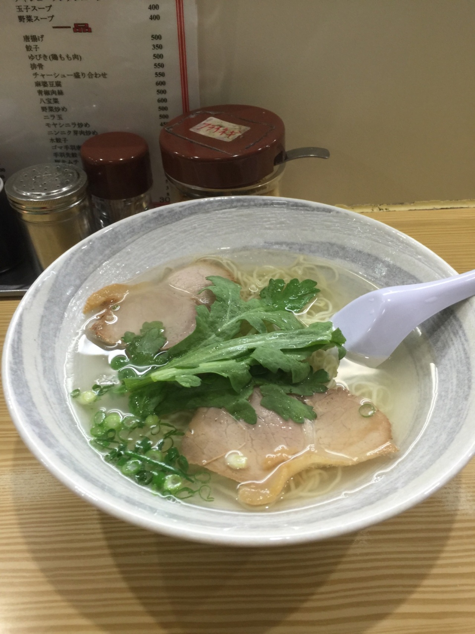 ラーメン680円を選択。若干黄色みがかった透明のスープに、独特のストレート細麺。