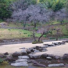 日本の有名な庭園にはよく曲水の宴を催す水辺がありますが、この仙巌園にもありました。水の流れのふちに出席者が座り、流れてくる盃が自分の前を通り過ぎるまでに詩歌を読み、盃の酒を飲んで次へ流す行事が曲水の宴です。曲がりくねった小川が流れています。