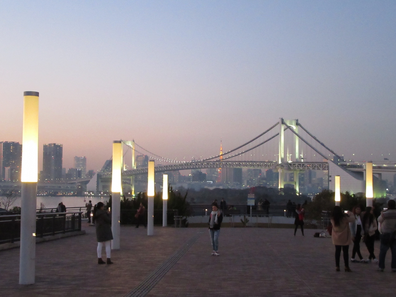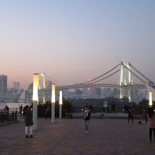 スカイウォークはゆりかもめお台場駅と海浜公園を結ぶデッキ製の遊歩道です。高いところにあるので景色とてもよく、自由の女神やレインボーブリッジ、都心の摩天楼や東京タワーなどを一望でき、記念撮影する人で休日はたいへん人気がある場所です。