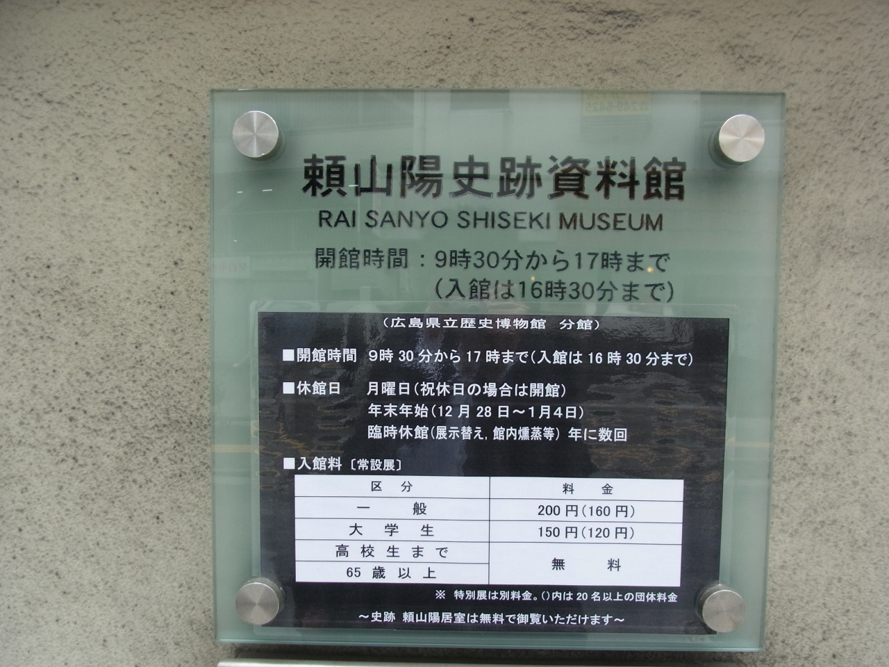 広島本通商店街から脇道にそれて5分くらいの所です。展示室1,2に分かれており1ケ月一度くらいのペースで展示内容も変更されているようです。頼山陽は、歴史・文学・美術などのさまざまな分野で活躍した江戸時代後期の日本を代表する漢学者で、歴史の分野では没後に出版された『日本外史』がベストセラーになり、幕末から明治初期の人々に大きな影響を与えました。