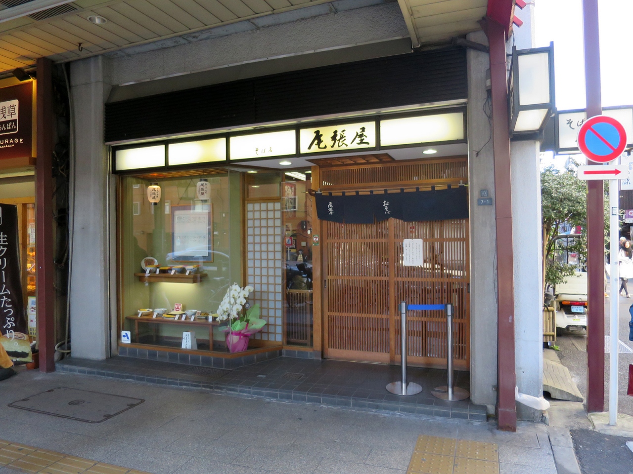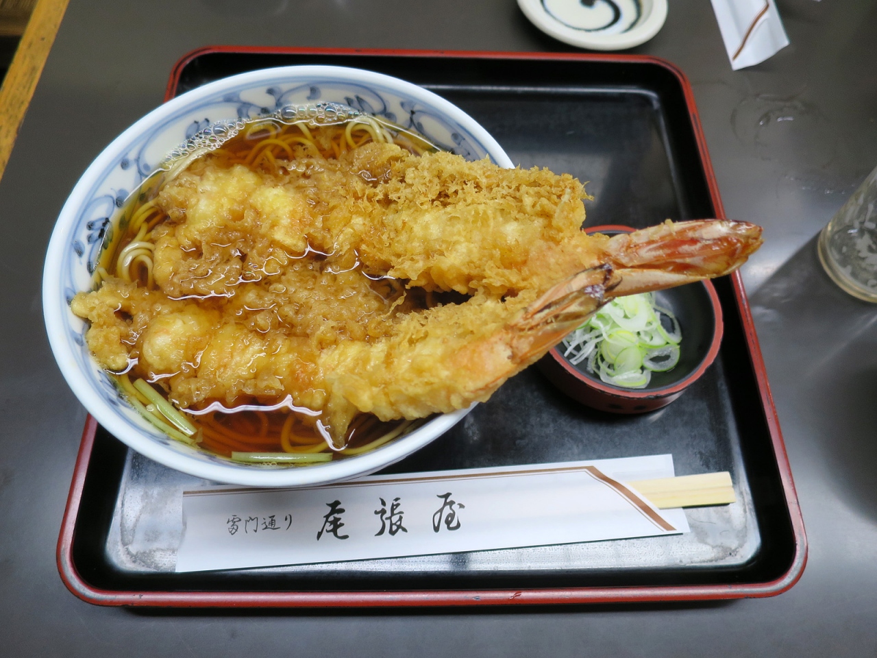 もう何年も前のこと、ここの天ぷらそばの写真を見て、「いつか…」と心に誓っていました。上品そうな汁に喉越し良さそうな細めのそば、その上に乗る2本の大きなエビ天、その衣は黒っぽくないことから、おそらく白胡麻油を用い…と、食べたこともないのに想像だけで数年間も楽しみました。そして、ついに、その日が来たのです。自宅からはるばる東西線と銀座線を乗り継ぎ、約30分で浅草「尾張屋」前に到着しました。このお店、創業は1870年ということですから、もう145年以上も前ということなんですね。時間は午後2時前でしたが、1階はほぼ満席。お運びさんのお兄さん・お姐さんは年季が入ってはいますが、入り口に立つ私をスル―。入り口には会計用のカウンターがあって、こちらには(立って仕事をするのが難しい程)うんと年季の入ったお姐さんが座っており、こちらのお姐さんに食事をする旨を申告し、さらに空席の有無を確認すると、やっと着席の許可が下りました。案内されたのは唯一空いていた6人掛けのテーブルで、先客に家族連れ客3人がお母さん・娘さん2人・お父さん1人に分かれて食事をしており、私はお母さん・娘さんが座っている側を指定されました。その直後に御同輩風の一人客が私の目の前に案内されましたので、どうやら入れ込み座敷のシステムを踏襲しているようです。ビールを注文したら乾きものが付いてきましたが、日本酒を注文した御同輩には焼き味噌らしいものが届けられていましたので、その点では、なかなか気が利く店らしいです。ただ料理を運ぶテーブルを指示する声などが大きすぎるのは感心しません。さて、憧れていた天ぷらそばは想像通り雑味のない汁、そばはチュルチュルと喉に吸い込まれ、大きな車エビを包む衣も嫌みがないものでした。汁にはほのかに柑橘の香りがありましたが、道理で食べている途中で蜜柑の皮らしい一片が出てきました(漉し忘れかな?)。接客姿勢やシステムは今一歩ですが、そばは美味しくいただきました。