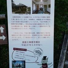 明治村3丁目の高台にある建物です。建物へと続く階段の脇には「平成27年5月中旬より調査工事着手」の案内板がありました。移築後49年が経過していて、各部の劣化が進んでいるため、建物内部を閉鎖して調査をしているようです。