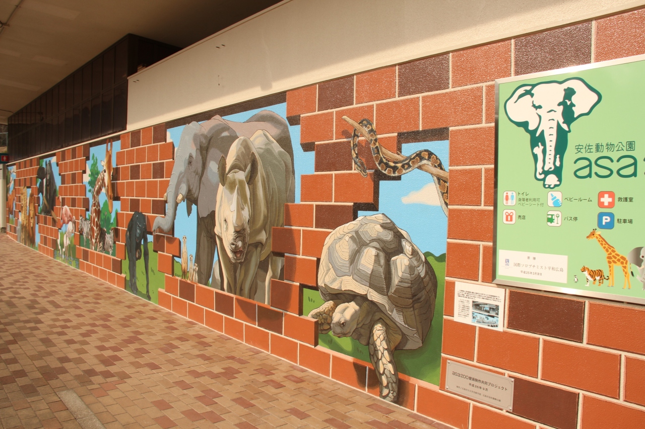 広い展示場に、複数のダチョウとキリン。シマウマが見られます。