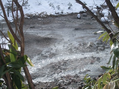 「鬼の相撲場」という広場を横に見ながら、下っていくと、温泉の硫黄の臭いがする川のせせらぎが聞こえて見えてきます。すると昨年リニューアルオープンした「西の河原大露天風呂」が右に見えてきます。男性用のお風呂が半分位、道から見えています。女性用は板塀の向こう側なので、見えることはありません。