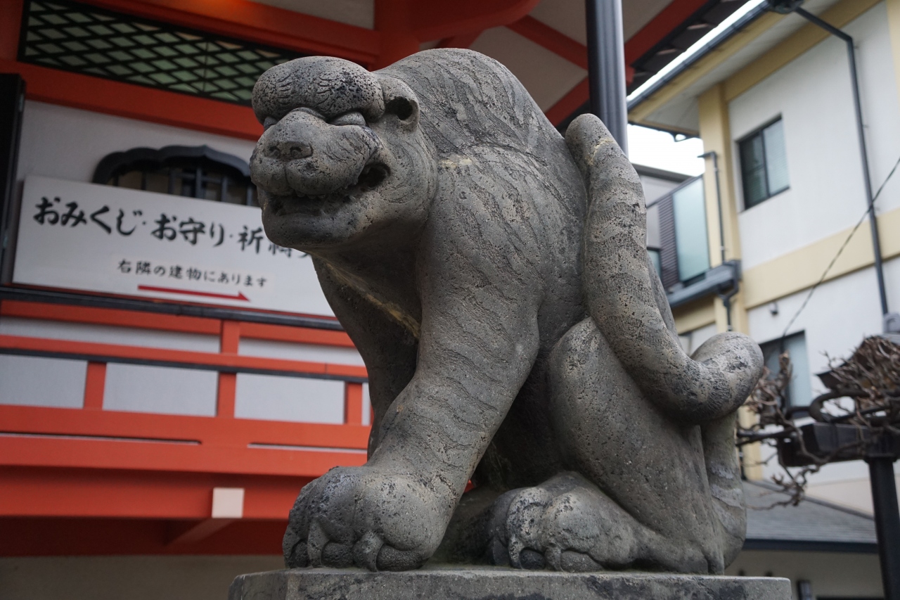 善国寺の本堂前にはこま犬ならぬ石虎というのがあります。これまでは何となく見ていましたが、確かに虎というのは珍しいかも。背中を丸めて、これはいつでも飛びかかれそうな野性味を感じる姿勢。台座にも虎が描かれていて、手が込んでいます。