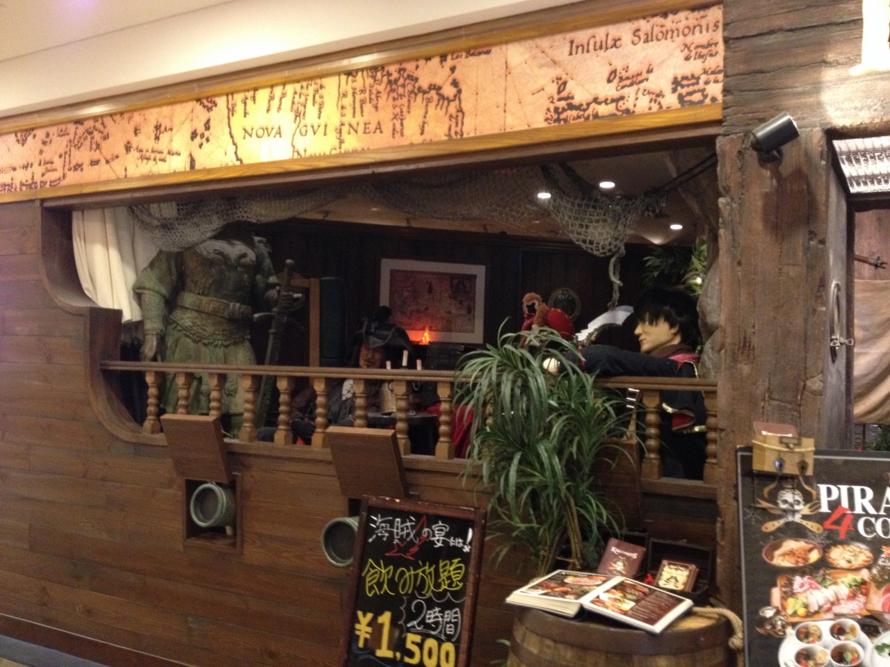 アクアシティ5階にありました。海賊をテーマにしたコンセプトレストランでスタッフもみんな海賊姿。なんだかディズニーランドのような雰囲気でした。土曜の夜は混雑しているようで入口で数組待ち。コンパでもしているのか若者のどでかい声が聞こえたりして、店内はかなり騒がしい様子。子供は中に入りたがりましたが、ランチタイムに再訪することにします。