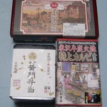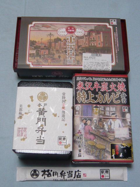 駅弁をお土産に購入。米沢牛特カルビ弁当1600円はやや甘い味付けの柔らかい米沢牛、しゅうまい2個、おいしい玉子が入ってます。水戸黄門弁当1300円は炊き込みご飯と幕の内二段弁当。東京弁当1650円はおススメの幕の内弁当。とれもおいしく頂きました。