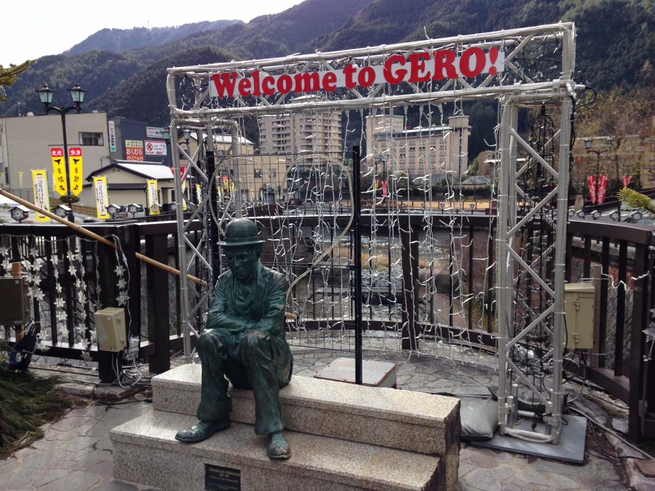 下呂駅から徒歩10分ほど下呂大橋を渡りまっすぐいくとある白鷺橋にある銅像で座っている姿がかわいらしい。横に座って一緒に写真にとれるようになっていて、観光客が写真とりに順番をまっていました。温泉街にあわない感じの背景も面白い