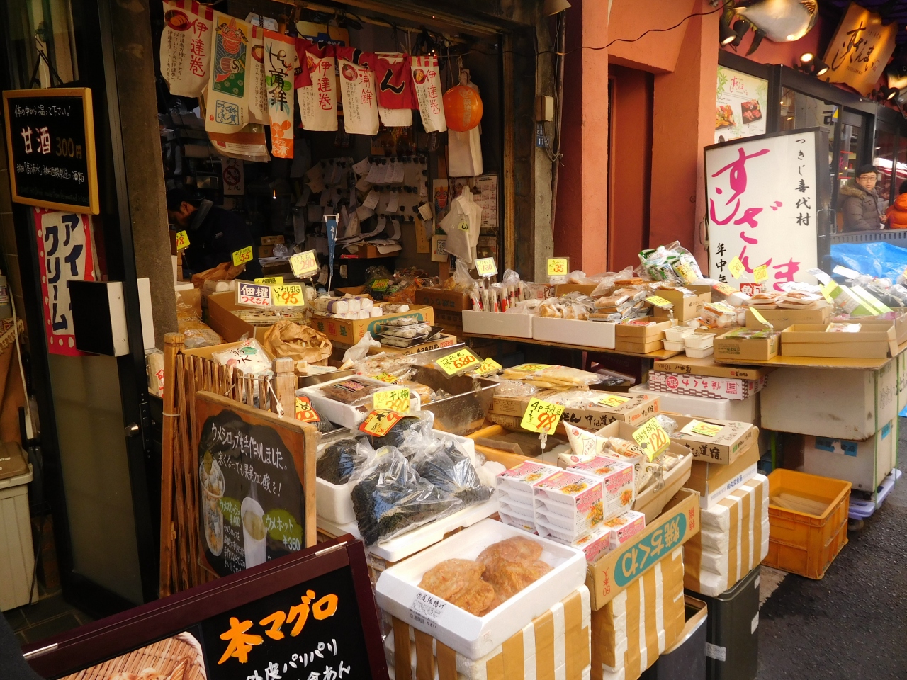 初めて築地市場に行きました。前から気になっていましたが、今回行ってみて楽しかったです。お寿司屋さんが多かったです。乾物類なども少しお安いようでした。卵焼のお店は