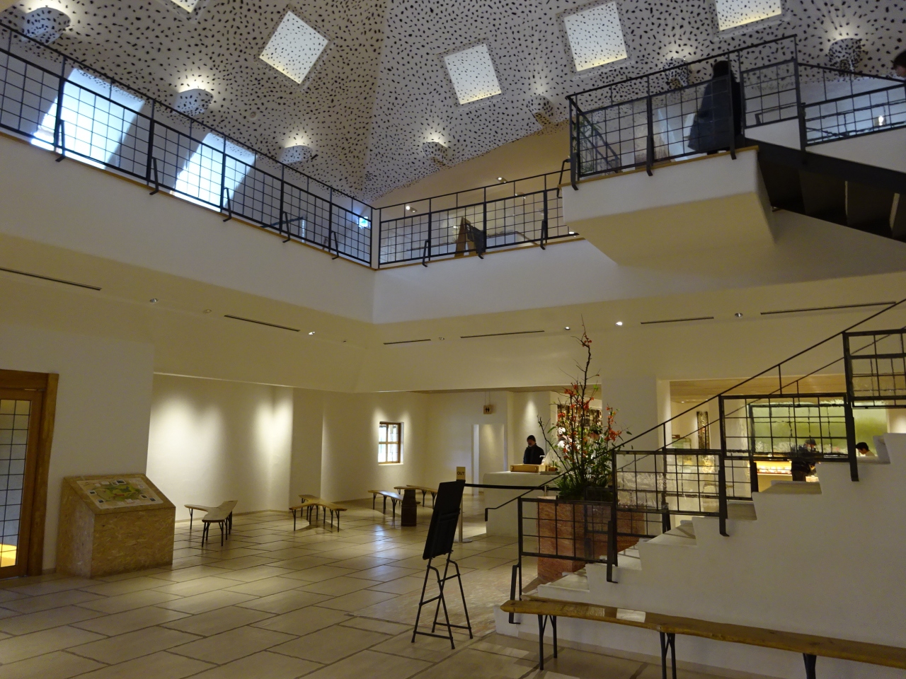 駐車場の向こうには茶色というか黄色というか草屋根の大きな建物が。