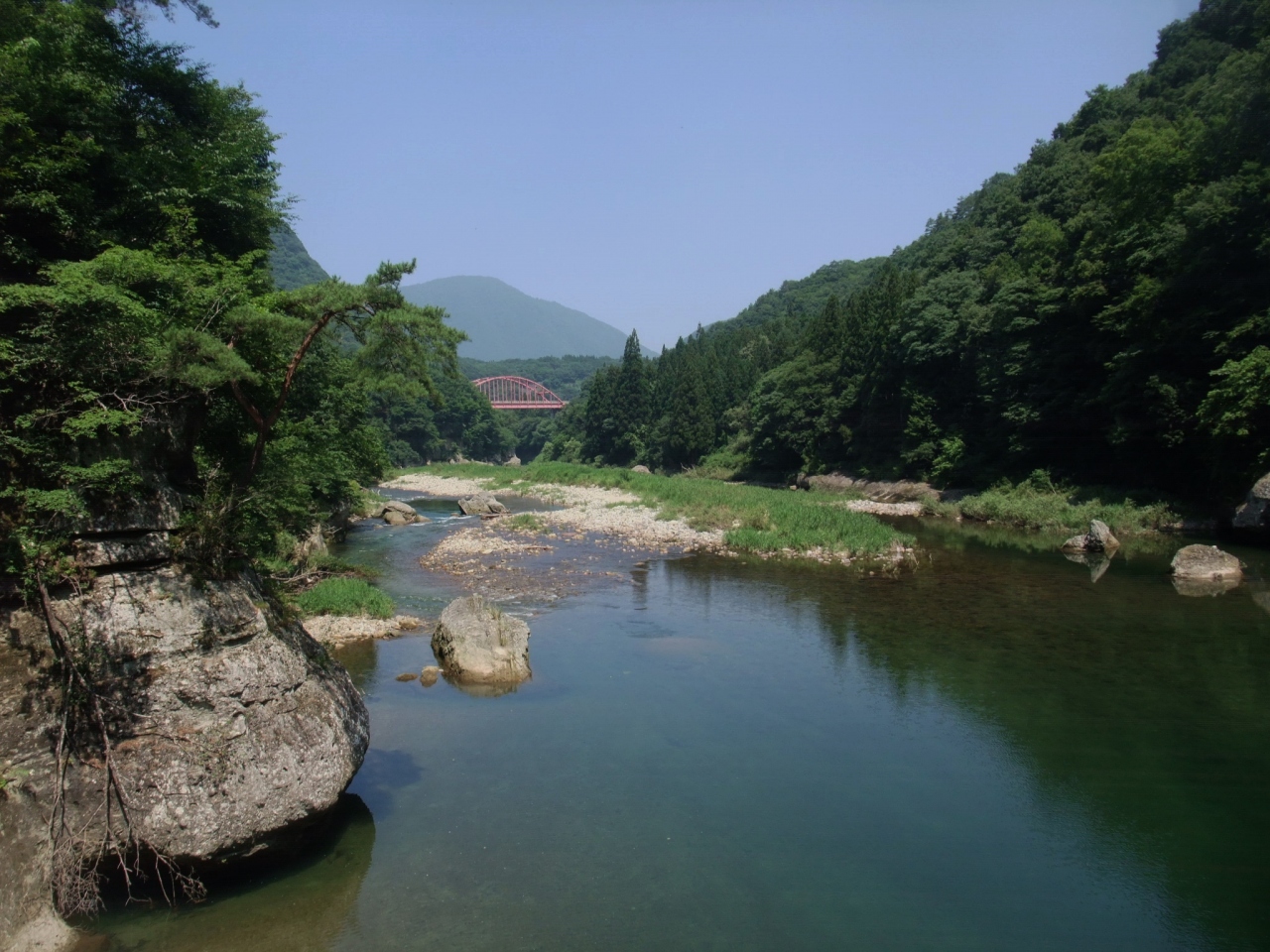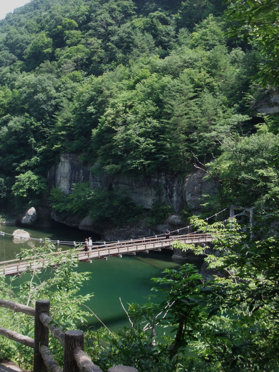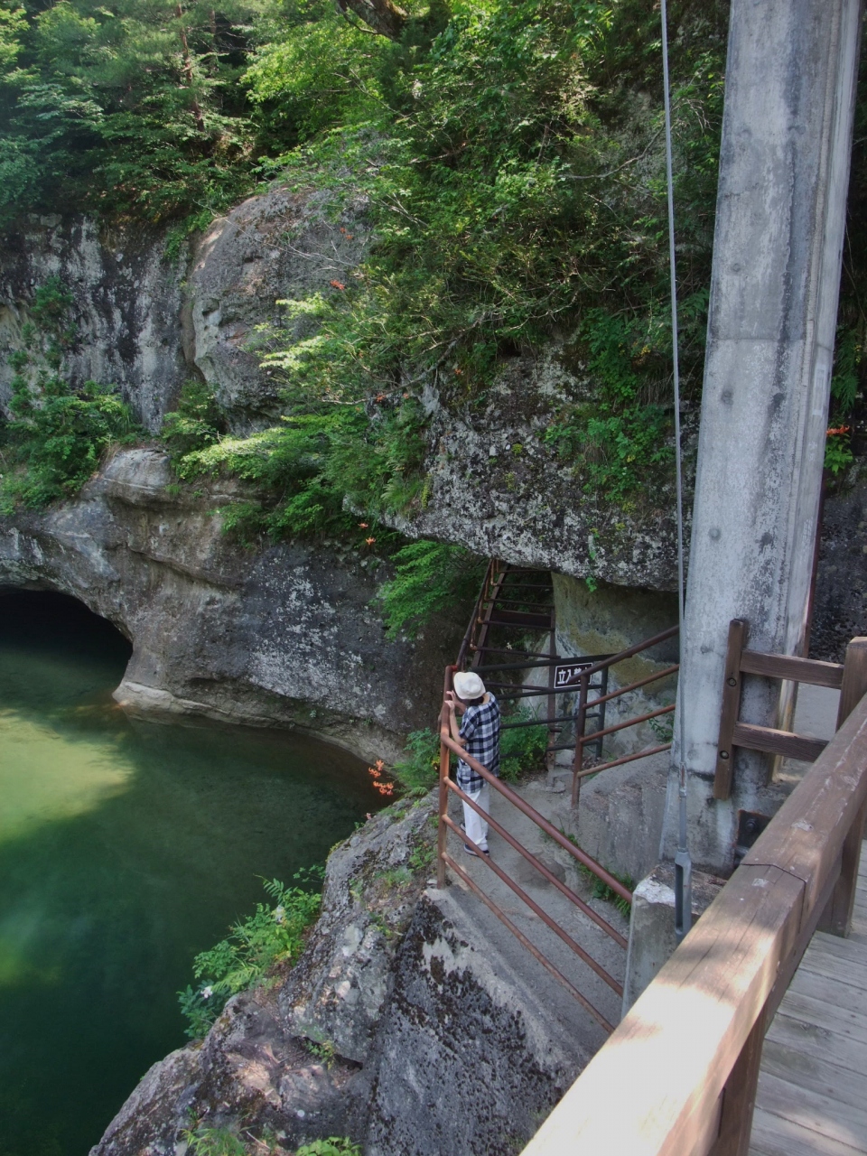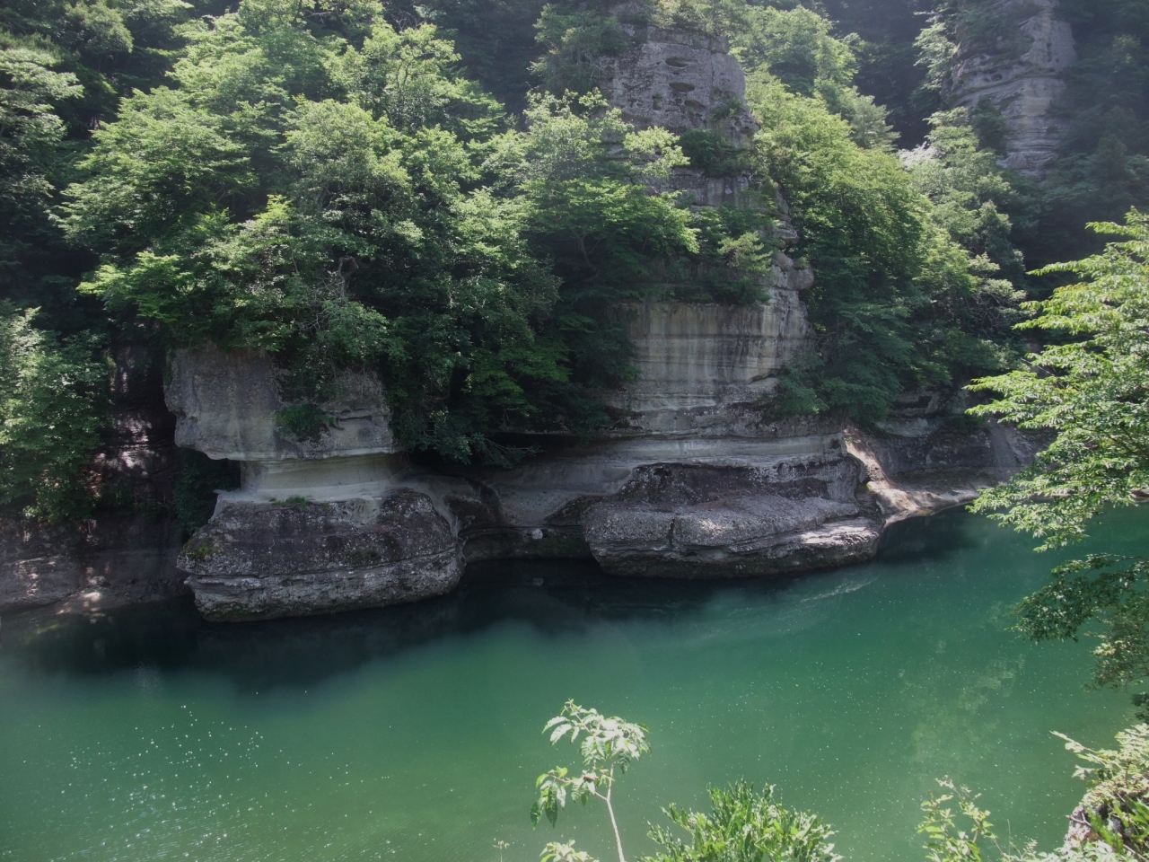 「塔のへつり」は秋の紅葉も、冬の雪の時期も、新緑の頃も美しいそうですが、緑濃い夏も、その緑が川に映る様はとても美しいです。