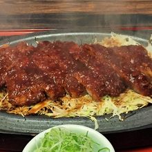 アツアツの鉄板の上に、キャベツを敷き、その上に揚げたてのロースとんかつをのせ、仕上げに味噌がたっぷりかかっています。