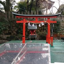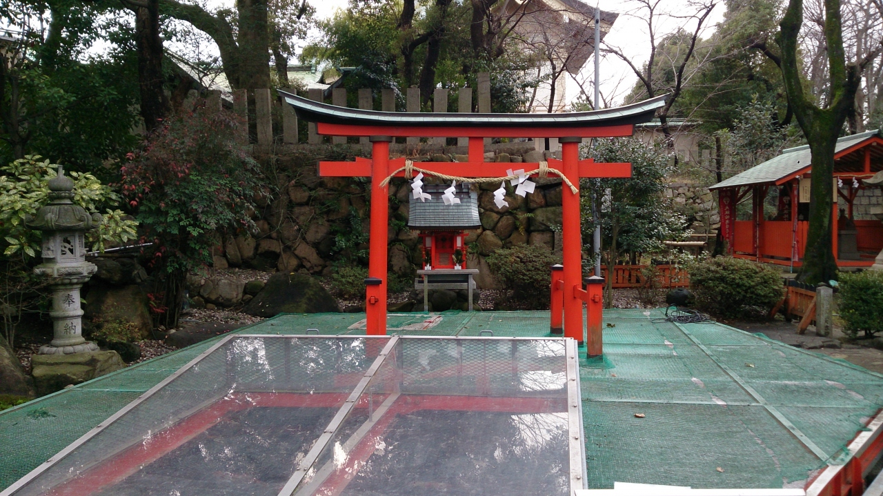 生國魂神社の広い境内の西北の一番奥に生國魂神社の末社が集まっている一画にあります。池の中に朱色のコンパクトな鳥居があって、その奥に小さな朱色の社があって、池については鉄製ネットとアクリル板でほぼ完璧に蓋がされており、ここまで完璧に蓋がされているのは、池を防護する目的で設置しているんでしょうが、ここまで合理的な施設はなかなか珍しいと思います。都会らしいな~という感じです。水産業関係の神様で漁業関係者、釣り人などに信仰されています。