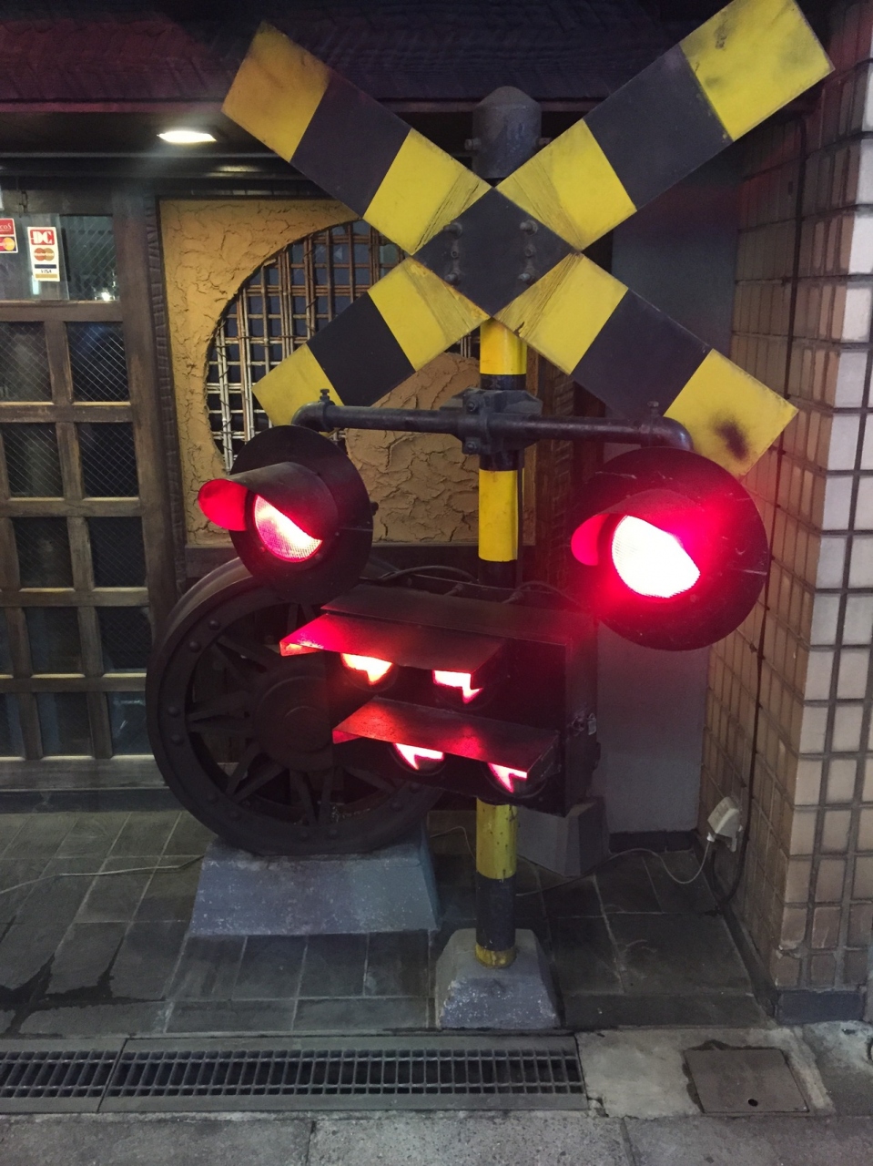 外観には踏み切りや駅の看板があり、店内には大きな煙突と囲炉裏がドーンとあり、端には美術品が飾れていたりと、とにかくインパクトがあります。