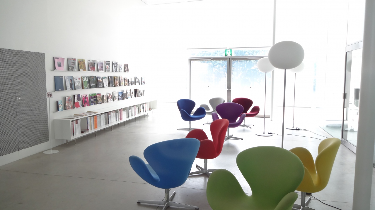 「まるびぃ」こと金沢21世紀美術館は、建築家ユニット、妹島和世と西沢立衛によるSANAAが、建物と街が−体になるデザインというテーマで設計しました。三方が道路に囲まれ、どこからでも訪れられるように、入り口が4つあり、正面や裏側といった区別のない大きな円形をしており、外壁はガラスで囲まれ、光がたくさん入る明るい美術館です。有料の「展覧会ゾーン」と無料の「交流ゾーン」に分かれ、交流ゾーンは気軽に入ることができます。あの「上からのぞくと、プールの中を歩く人の姿が見える」レアンドロ・エルリッヒの作品もここにあります。