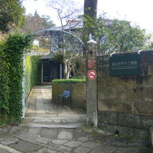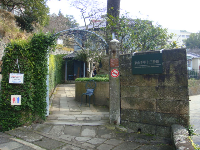 オランダ坂中腹にある空色の外壁の洋館で、明治中期にフランス領事館として建てられました。現在は喫茶店して公開されており、お土産物も置いてあり、気軽に入ることができます。門の前にトイレの看板が出ていましたので、ちょっとお借りすることもできるかもしれません。