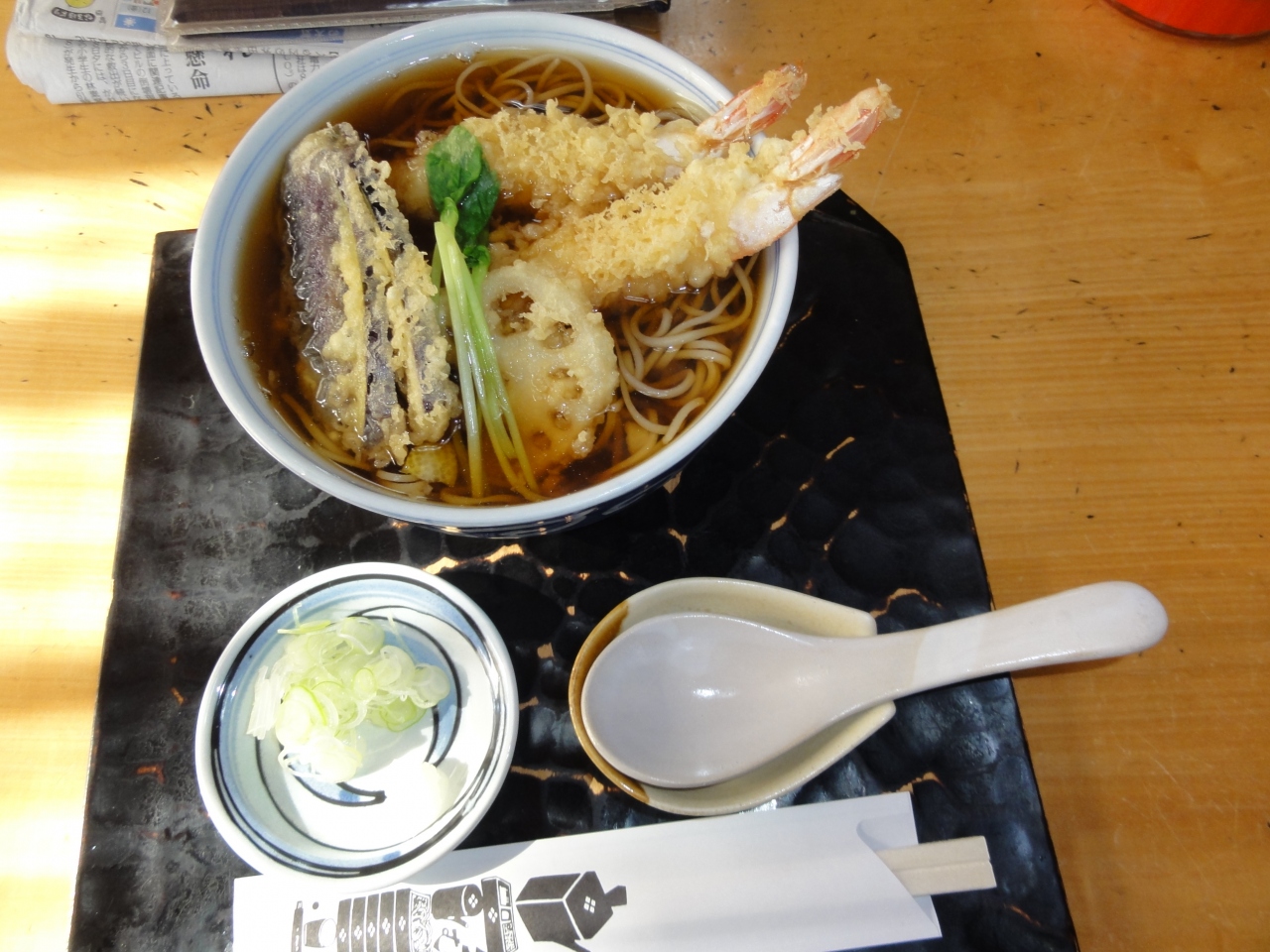 天ぷらそばを食べましたが、海老の他にれんこん、なすものっていました。三つ葉やゆずの風味も良く、葱や少量の大根おろしもついた汁は優しい味でした。細めの蕎麦によく合っていました。美味しかったです。